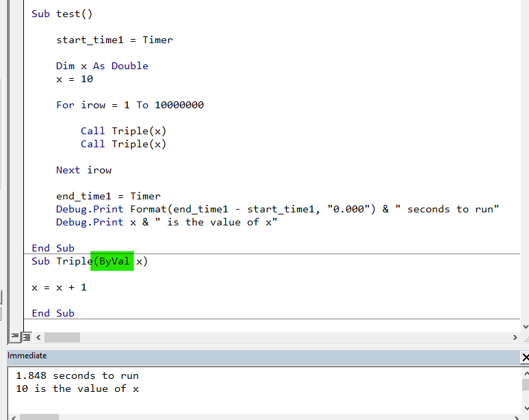 When passing arguments to a procedure (sub or function) the default will be ‘byRef’ in Excel VBA, thus you don’t have to write ‘byRef’ before the variable. If you want to pass ByVal you have to explicitly write ‘ByVal’ before the variable. When using ByVal you are only passing a copy of the argument to the function or sub and the original value is not changed. When passing arguments you always want to declare the variable as this will help your code run faster. If you leave out the declaration. Excel will assume as variant which takes longer to process. About 2.5 times longer according to the tests below.